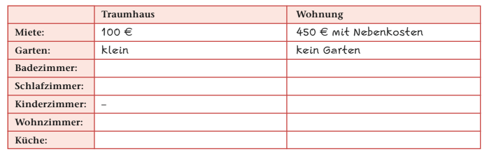 Mein Traumhaus ist sehr groß, 200 m². Einen Garten hat es auch. Er ist nicht groß. Ich arbeite nicht gern im Garten, 100 m² sind genug. Einen Balkon habe ich dort auch. Ich sehe gern in den Garten. 100 € Miete sind genug, natürlich mit Nebenkosten.