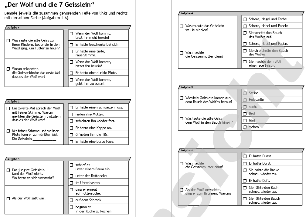 Jetzt muss der Wolf sich etwas Neues überlegen. Damit seine Stimme so zart wird, wie die der Ziegen-Mutter, frisst er Kreide. Er klopft erneut. „Macht auf, ihr lieben Kinder, eure Mutter ist da und hat jedem von euch etwas mitgebracht.“ Dieses Mal glauben die Geißlein tatsächlich, dass es die Stimme ihrer Mutter ist. Doch sie erkennen den Wolf an seinen schwarzen Füßen. „Wir machen nicht auf, unsere Mutter hat keinen schwarzen Fuß wie du; du bist der Wolf.“