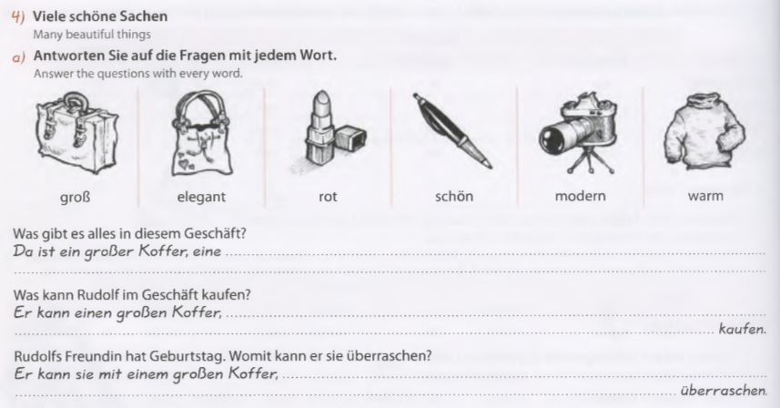 | Dativ | dem alten Mann | der schönen Frau | dem kleinen Kind | den neuen Schuhen |